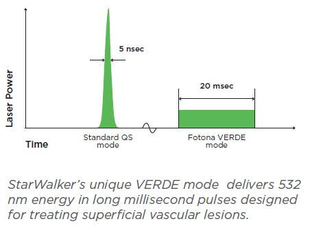 Die Technologie der dritten Generation von StarWalker kombiniert die unübertroffene Auswahl an Pulsdauer-Modi der VSP Technologie (Variable Square Pulse) von Fotona mit der revolutionären Fähigkeit von ASP™, die zeitliche Struktur von Laserpulsen an die biophotonische Dynamik der Laser-Gewebe-Wechselwirkung anzupassen. StarWalker ist in der Lage, bis zu 10 J Q-Switched Energie in einem riesigen, strukturierten MaQX-Impuls für die Behandlung von epidermalen und dermalen pigmentierten Läsionen zu liefern, und umfasst Infrarot VERSA3 und grüne VERDE™ Modi für bessere vaskuläre Behandlungen.