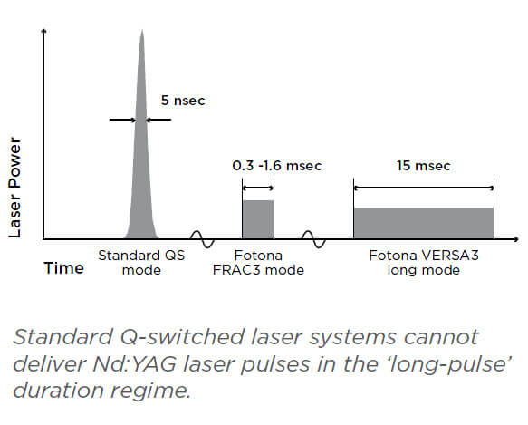 Die Technologie der dritten Generation kombiniert die unübertroffenen Auswahl an Impulsdauer-Modi der VSP Technologie (Variable Square Pulse) von Fotona mit der revolutionären Fähigkeit der ASP Technologie, die zeitliche Struktur von Laserimpulsen an die biophotonische Dynamik der Laser-Gewebe-Wechselwirkung anzupassen.