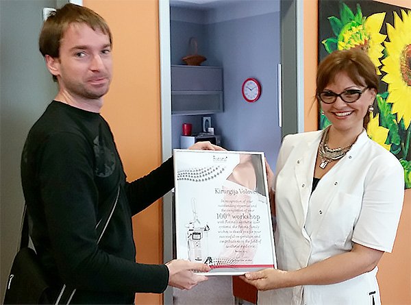 At the beginning of the workshop, Dr. Volovec was presented with a certificate from Fotona commemorating the occasion and recognizing her contributions to the field of aesthetic medicine. Dr. Volovec graduated from the Zagreb Faculty of Medicine in 1987 and went on to become a resident in General Surgery at Brezice Hospital in Slovenia and then a Specialist in General Surgery at the Ljubljana University Medical Center in 1997. She started up a private surgery in 2005 in Brezice and has since that time specialized in laser surgery.