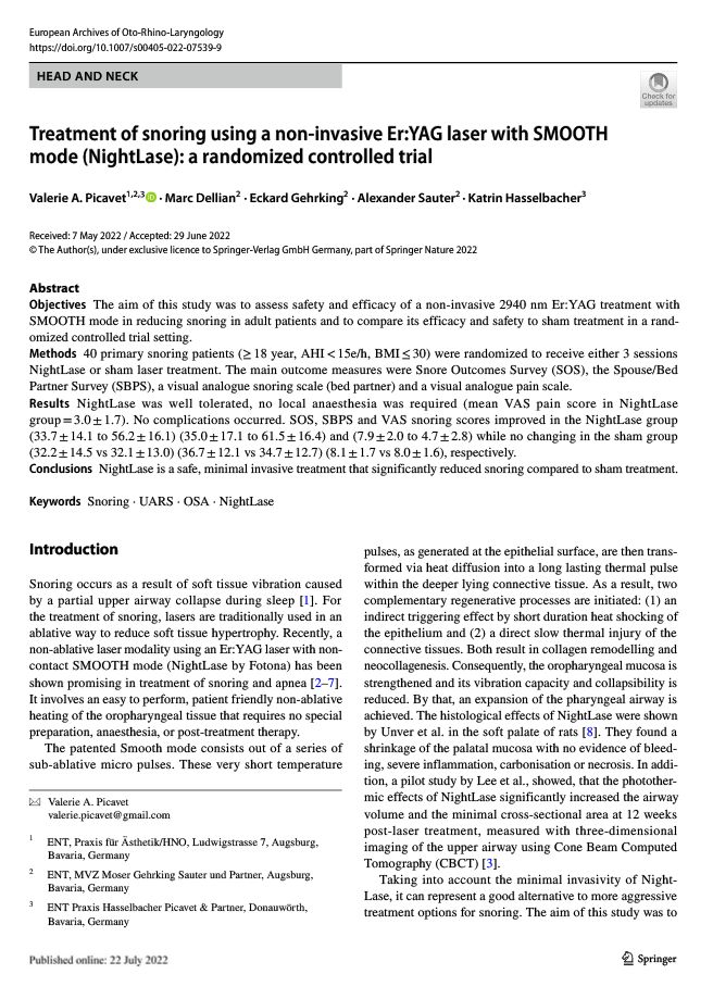 The full text of the journal article, titled: Treatment of snoring using a non‑invasive Er:YAG laser with SMOOTH mode (NightLase): a randomized controlled trial, can be viewed on the publisher's website.