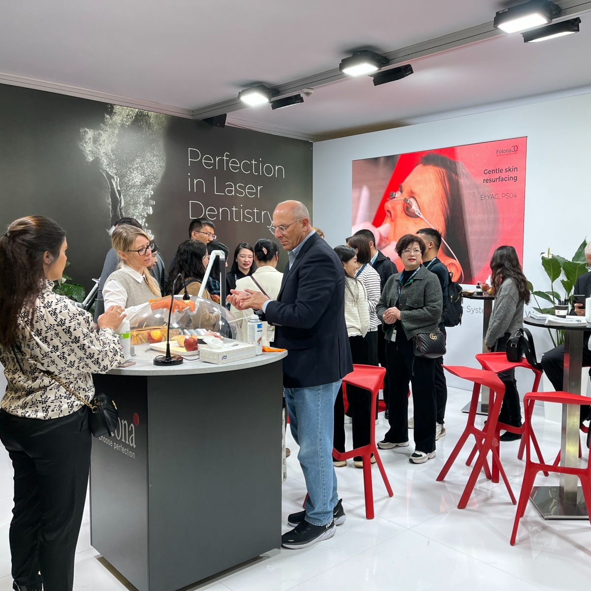 The Fotona booth, with its new and refreshed design, was a crowd-pleaser, attracting a large number of visitors with its hands-on demonstrations and eye-catching video animation of SWEEPS bubbles in action. The booth also featured the presence of notable clinical experts, including Dr. Ilay Maden, who even gave a lecture right at the booth with a projection on the wall that attracted the attention of numerous passers-by.